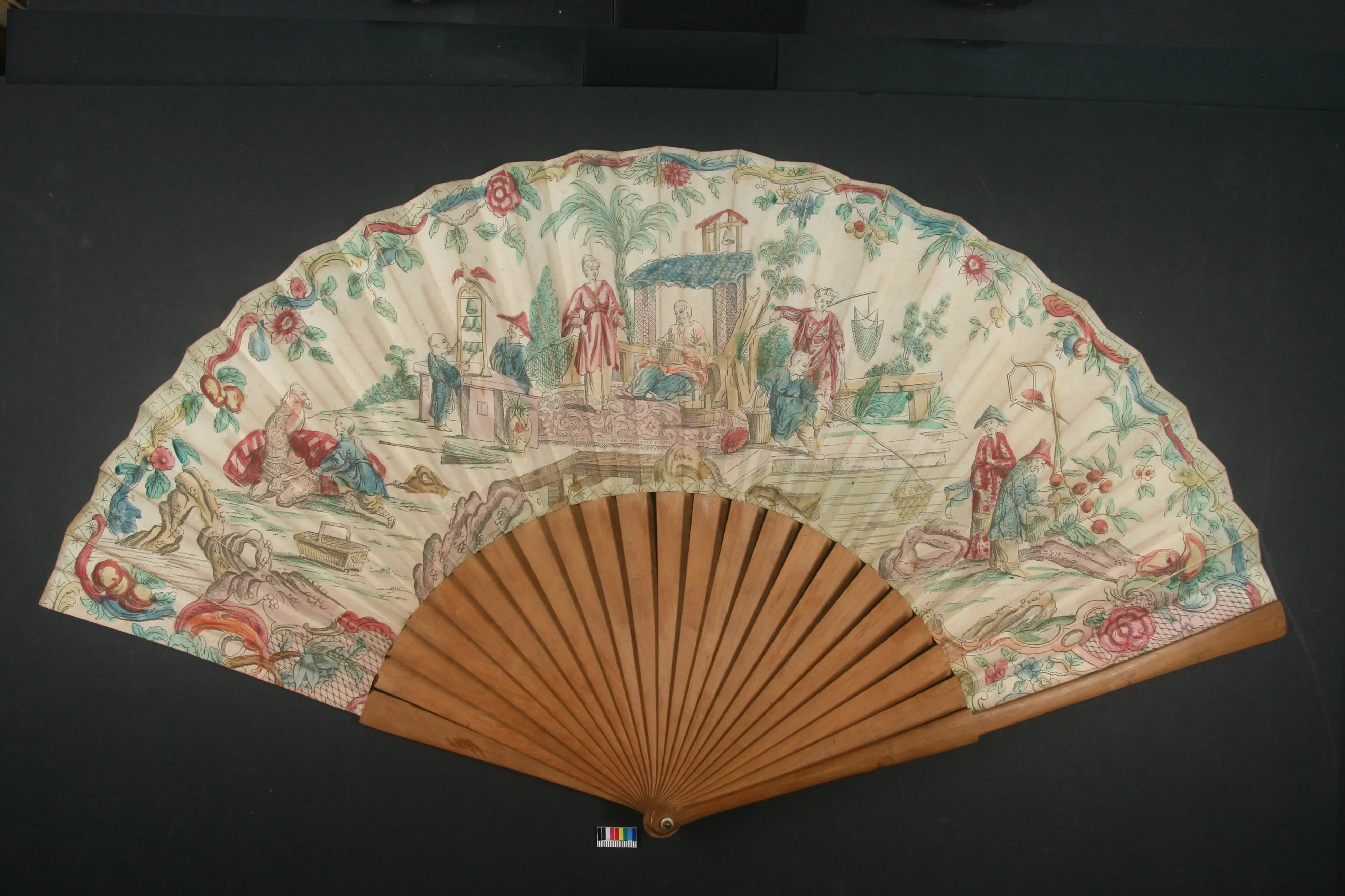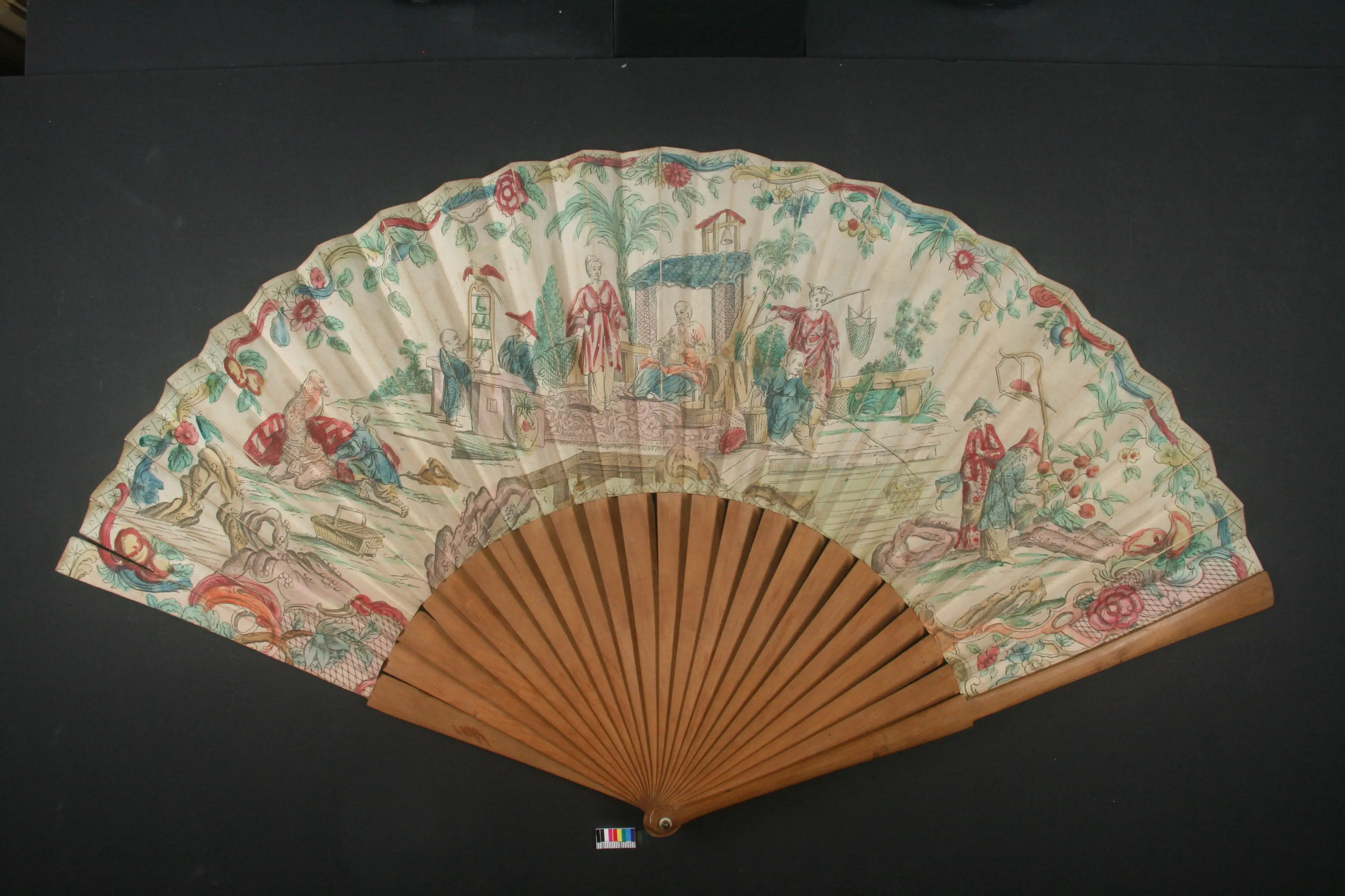 An zwei Blättern des Fächers wurden Ergänzungen aus Balsaholz gefertigt, eingefärbt und mit Weizenstärkekleister angebracht. Zusätzlich wurden mehrere Risse, die im Holz vorlagen, auf die gleiche Weise geschlossen.